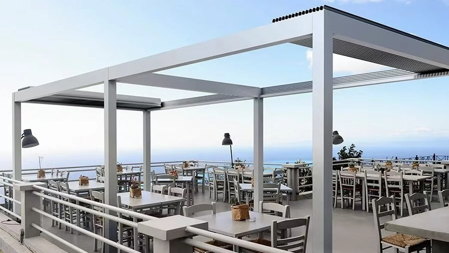 The R8 Structural Pergola represents the pinnacle of engineering for large-scale outdoor installations. Designed for expansive villa terraces, rooftop spaces, and commercial venues, this reinforced system handles coverage up to 60-70m² per bay with exceptional structural integrity. The motorized aluminum louver roof features full weather sealing, rotating from 0° to 135° for precise climate control and ventilation management.